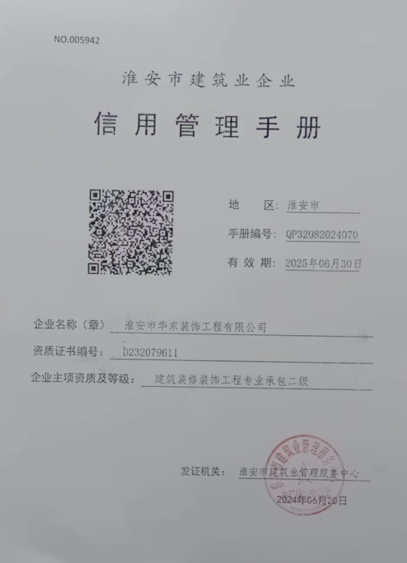 淮安市華東裝飾工程有限公司成立于2005年1月,企業(yè)性質(zhì)為民營(yíng)股份制企業(yè),是一家管理體制,質(zhì)量保證體系嚴(yán)密的專業(yè)裝飾公司,是淮安裝飾業(yè)界優(yōu)秀企業(yè)之一。企業(yè)注冊(cè)資金1010萬(wàn)元,擁有建筑裝飾裝修專業(yè)承包二級(jí)資質(zhì);電子與智能化工程專業(yè)承包二級(jí)資質(zhì);了解更多>>